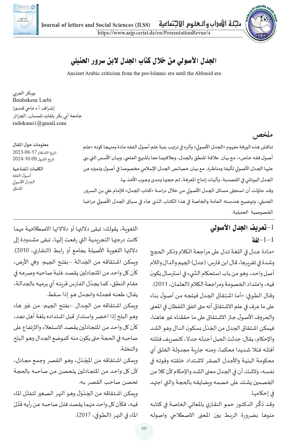 Cet article discute du concept d’ « Aljadal al usouli » et de son impact sur l »organisation de la structure de la science des « principes fondamentaux de la jurisprudence » en tant que sujet et méthode, car il s »agit d’une « science spéciale des principes fondamentaux de la jurisprudence », avec une clarification de la rapport de la logique à la controverse, et leur relation avec la méthode scientifique, et une explication des fondements sur lesquels le débat fondamentaliste s’est construit dans sa composition et son débat, avec un énoncé des caractéristiques du débat islamique en particulier. Dans ses origines et sa distinction avec le débat grec sur l’intentionnalité, les mécanismes de production de connaissance, puis son argumentation et la mesure dans laquelle il faut l’adopter.