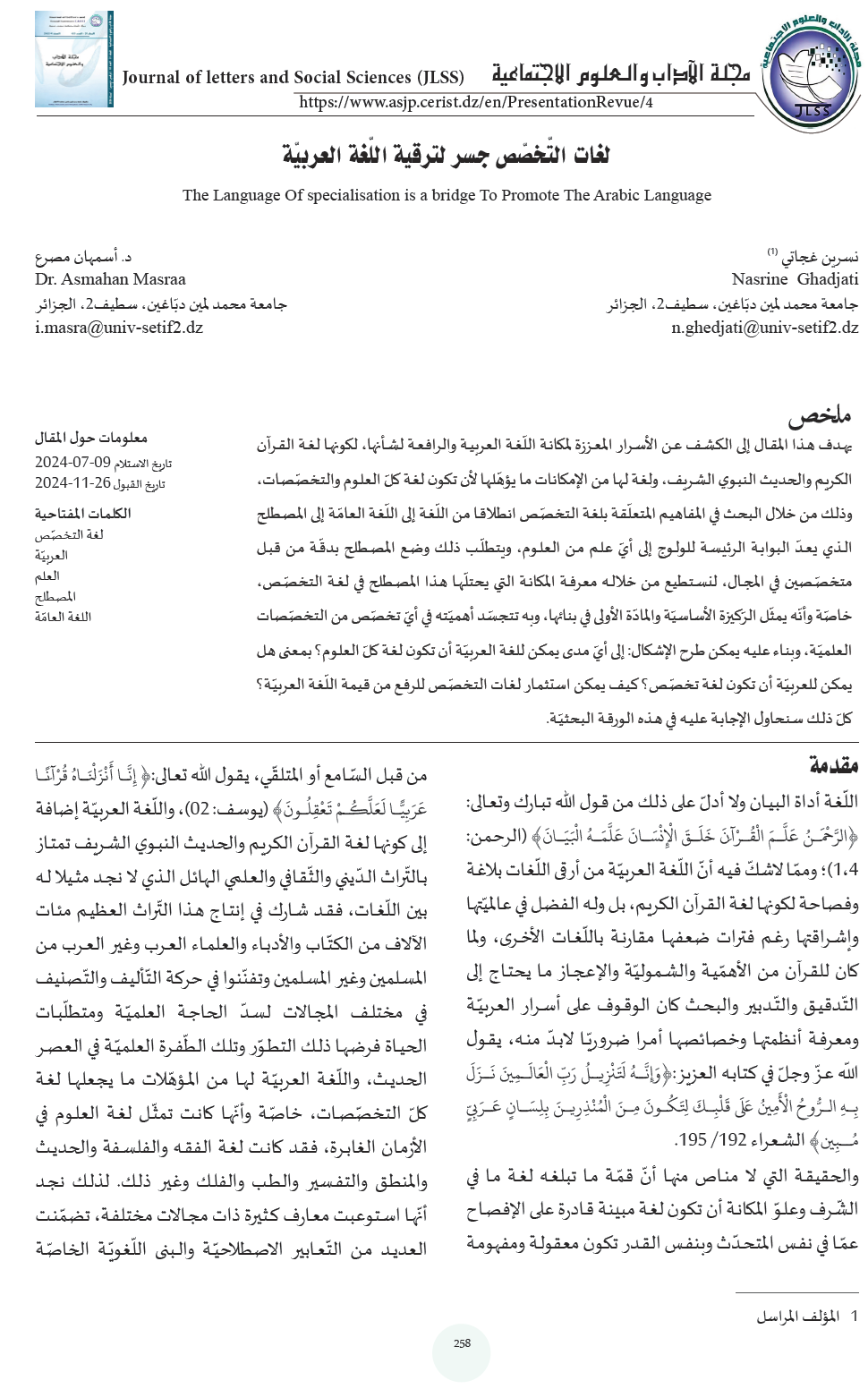 This article aims to reveal the secrets that enhance the position of the Arabic language and raise its status as it is the language of the Holy Qur’an and the Noble Prophet’s Hadith and a language that has the potential to be qualified to be the language of all sciences and specialisations through research into the concepts related to the language of specialisation, starting from the language to the general language then to the term that is considered the main gateway to accessing any science. This requires the precise definition of the term by specialists in the field, through which we can know the position that this term occupies in the language of the specialisation, especially since it represents the main pillar and the first material in its construction, and its importance is embodied in any scientific specialisation. Therefore, the problem can be raised: To what extent can the Arabic language be the language of all sciences? That is, can the Arabic language be a language of specialisation? How can we invest in the languages of specialisation to increase the value of the Arabic language? All of this will be tried to be answered in this research paper.