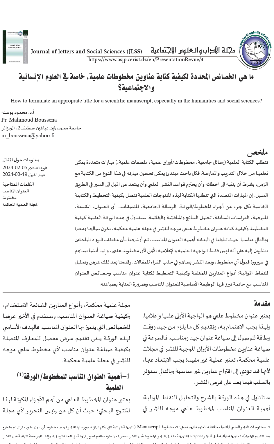 بوسنه م. (2025). ما هي الخصائص المحددة لكيفية كتابة عناوين مخطوطات علمية، خاصة في العلوم الإنسانية والاجتماعية؟: معلومات حول المقال: تاريخ الاستلام 2024-02-05 ***** تاريخ القبول 19-03-2024. مجلة الآداب و العلوم الإجتماعية, 21(01), 33–40. استرجع في من https://revues.univ-setif2.dz/index.php/jlss/article/view/109