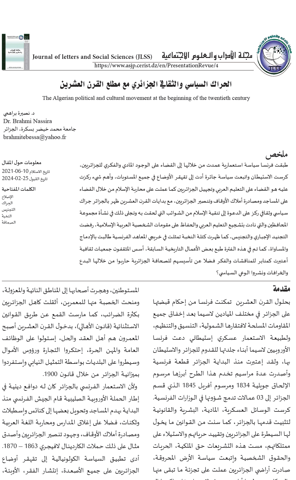 براهمي ن. (2025). الحِراك السياسي والثقافي الجزائري مع مطلع القرن العشرين: معلومات حول المقال: تاريخ الاستلام 2021-06-10 ***** تاريخ القبول 25-02-2024. مجلة الآداب و العلوم الإجتماعية, 21(01), 41–52. استرجع في من https://revues.univ-setif2.dz/index.php/jlss/article/view/111