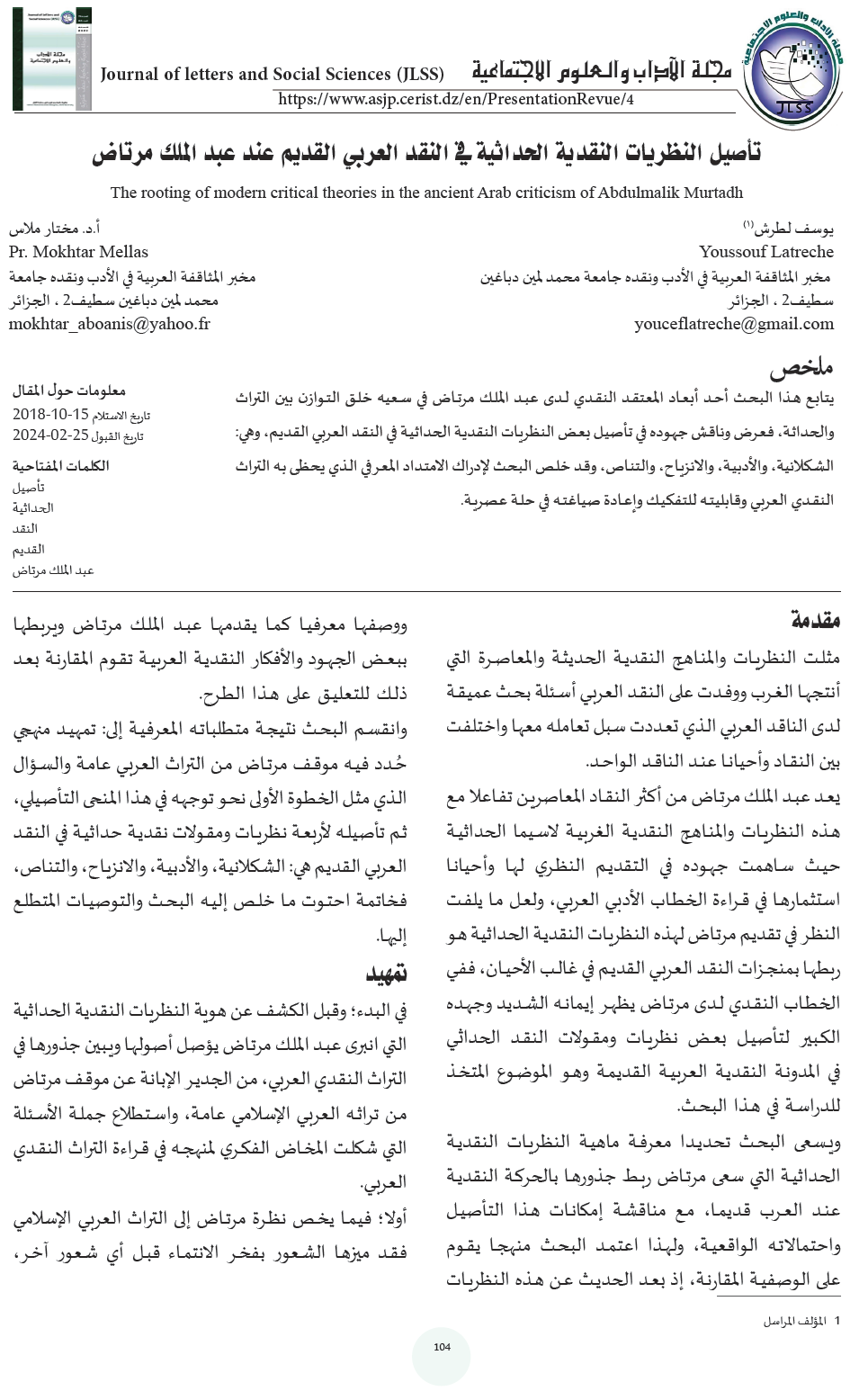 لطرش ي., & ملاس م. (2025). تأصيل النظريات النقدية الحداثية في النقد العربي القديم عند عبد الملك مرتاض: معلومات حول المقال: تاريخ الاستلام 2018-10-15 ****** تاريخ القبول 25-02-2024. مجلة الآداب و العلوم الإجتماعية, 21(01), 104–112. استرجع في من https://revues.univ-setif2.dz/index.php/jlss/article/view/117