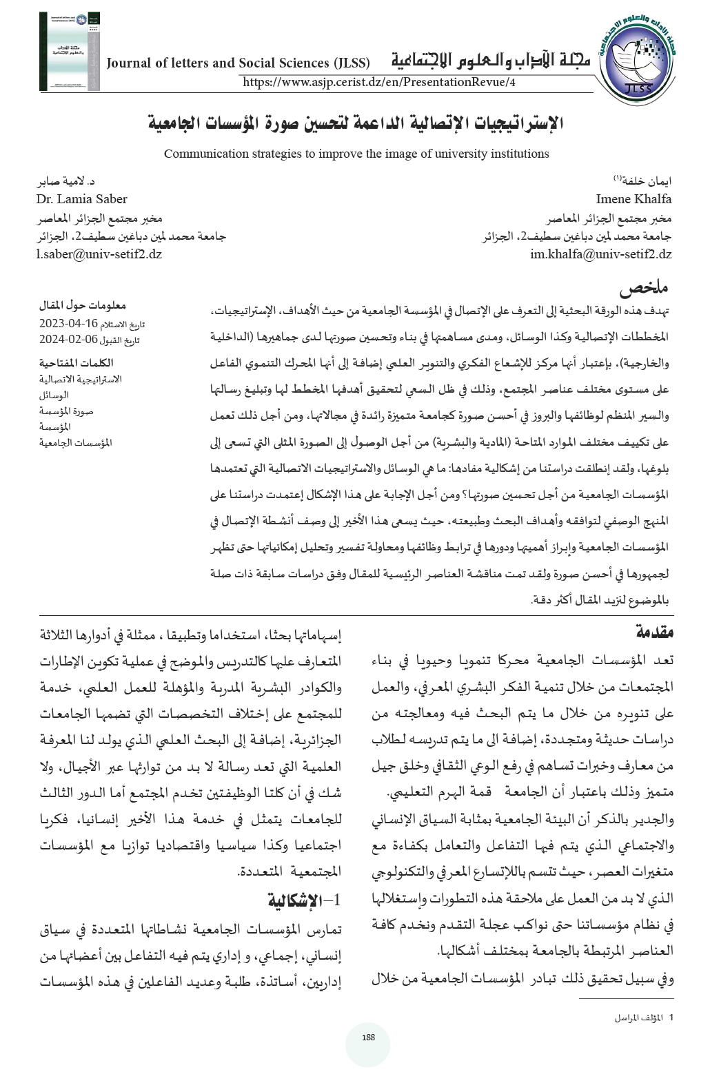 خلفة ا., & صابر ل. (2025). الإستراتيجيات الإتصالية الداعمة لتحسين صورة المؤسسات الجامعية. مجلة الآداب و العلوم الإجتماعية, 21(01), 188–206. استرجع في من https://revues.univ-setif2.dz/index.php/jlss/article/view/131