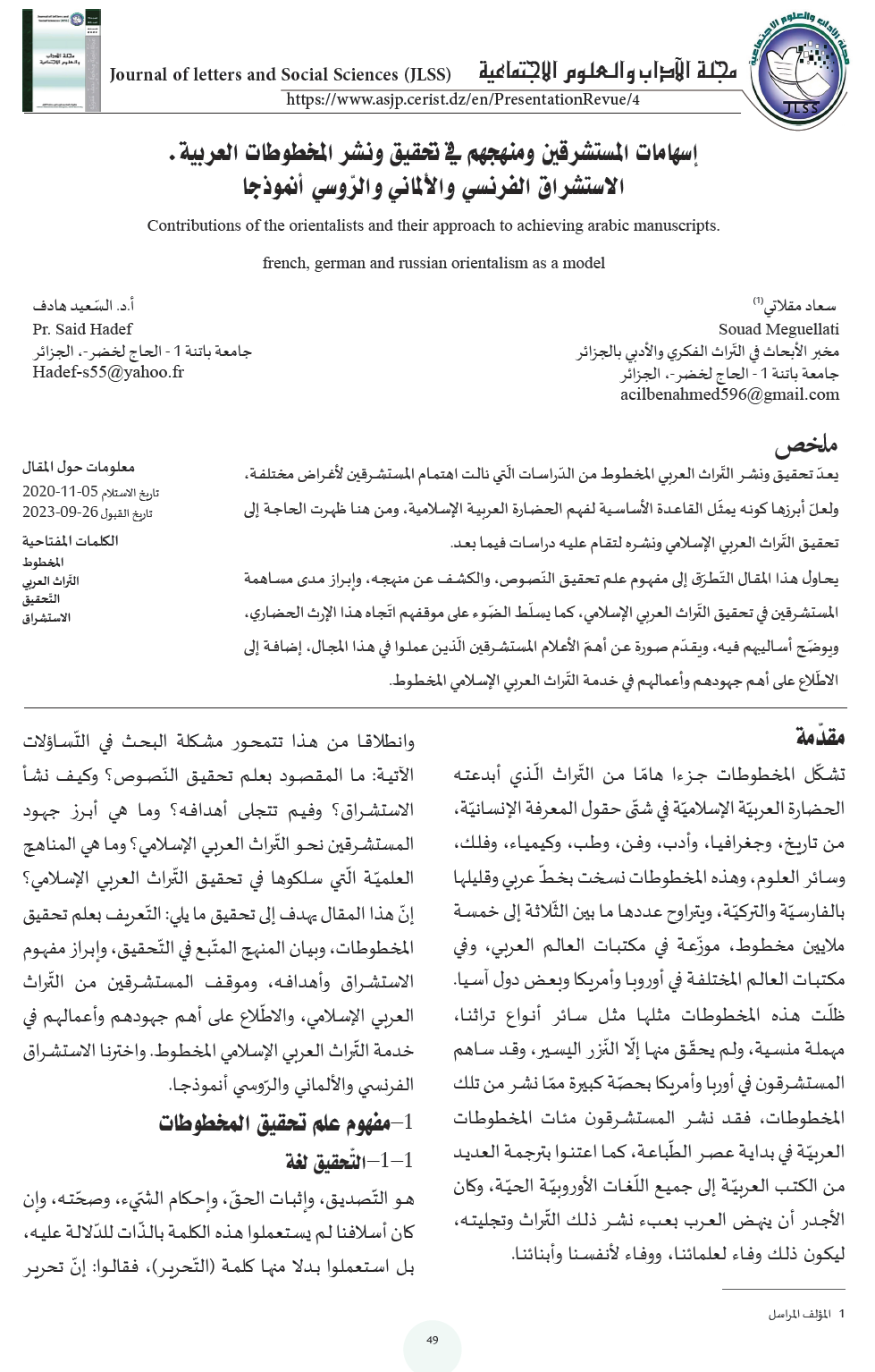 attracted the attention of orientalists for various purposes, perhaps the most prominent of which is that it represents the basic basis for understanding the Arab-Islamic civilization, hence the need to investigate the Arab-Islamic heritage and publish it to be studied later. This article attempts to address the concept of textual verification, reveal its methodology, highlight the extent to which orientalists contribute to the realization of the Arabic-Islamic heritage, highlight their position towards this cultural heritage, clarify their methods in it, and provide a picture of the most important orientalist figures who worked in this field, in addition to seeing their most important efforts and works in the service of the Arabic-Islamic manuscript heritage.