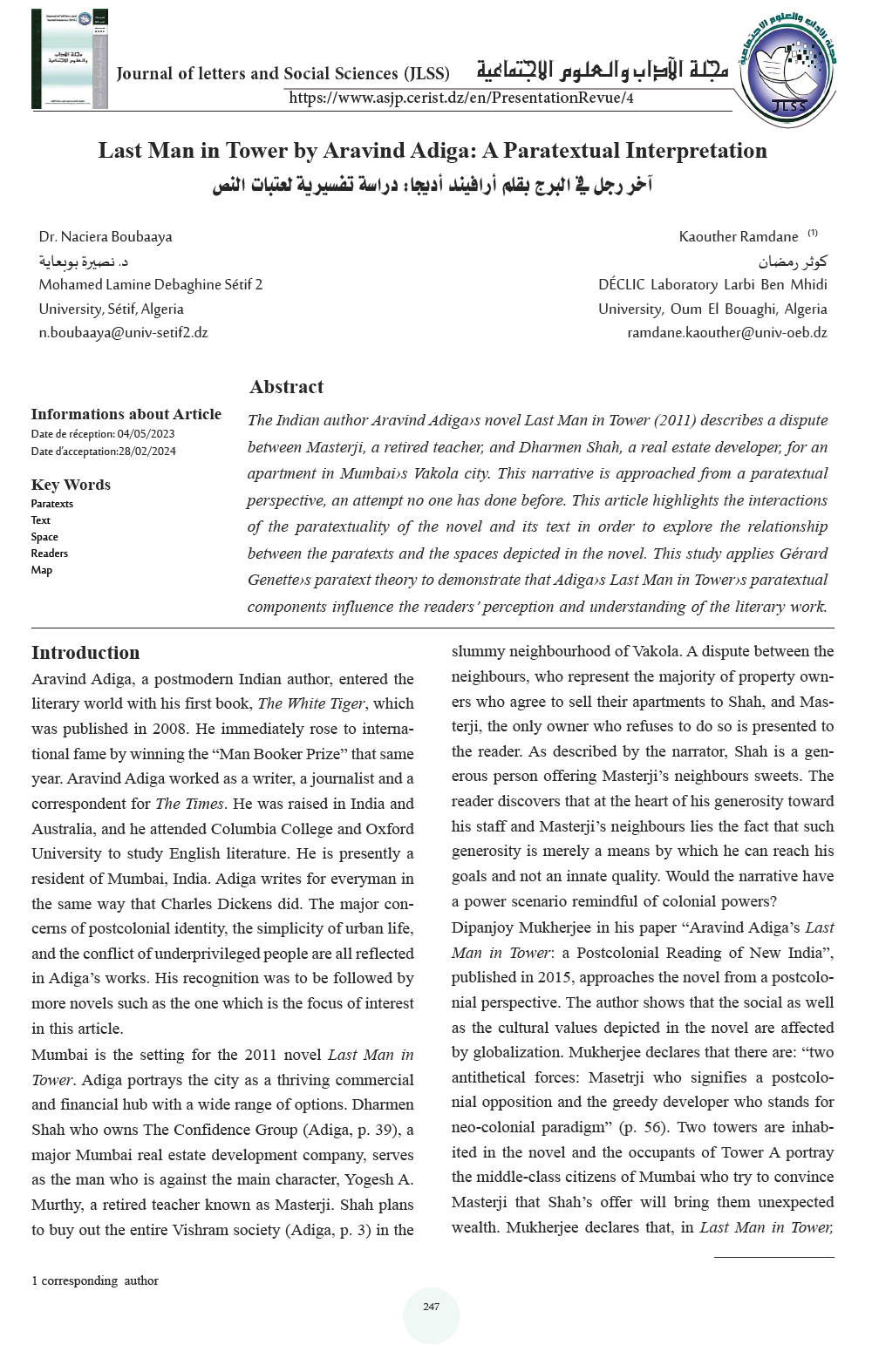 تصف رواية المؤلف الهندي أرافيند أديغا، تحت عنوان آخر رجل في البرج (2011)، نزاعًا بين المدرس المتقاعد ماسترجي، والمطور العقاري دارمن شاه، حول شقة في مدينة فاكولا في مومباي. يدرس المقال العتبات النصية لهذه الرواية، المنظور الذي لم يتطرق له أحد من قبل، حيث يسلط الضوء على التفاعلات بين عتبات الرواية ونصها لاكتشاف العلاقة بينها وبين الفضاءات المصورة في الرواية. تطبق هذه الدراسة نظرية عتبات النص لجيرارد جينيت لإثبات أن العناصر الشبه النصية لرواية أديغا آخر رجل في البرج تؤثر على إدراك القراء وفهمهم لهذا العمل الأدبي.