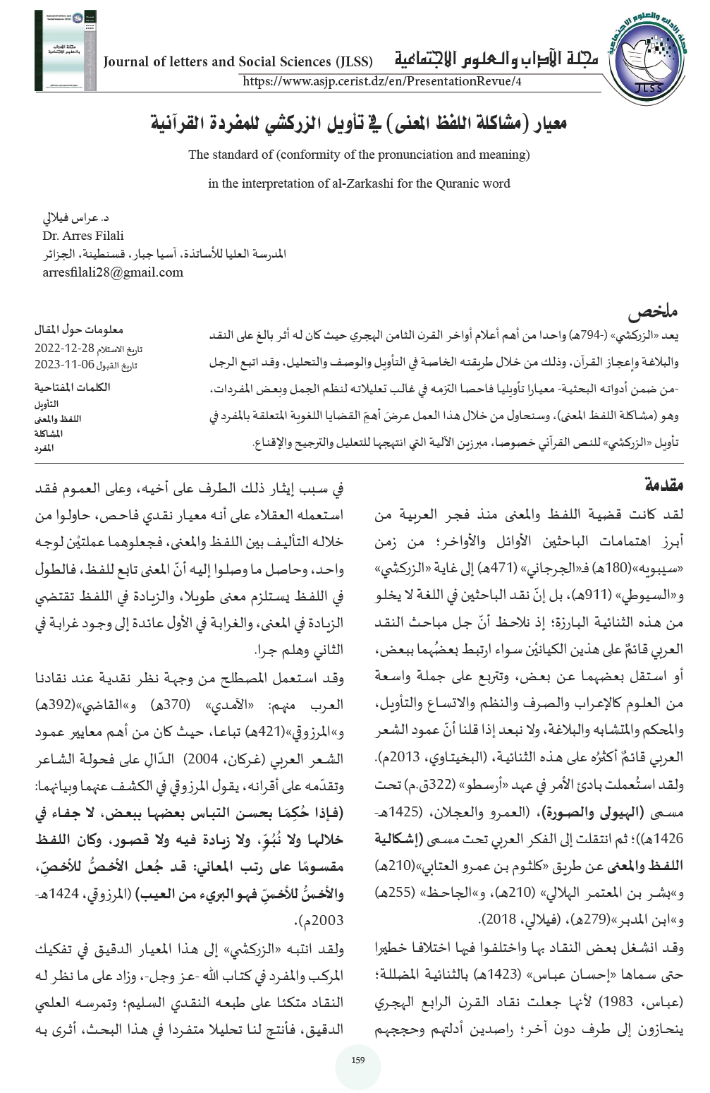 فيلالي ع. (2025). معيار (مشاكلة اللفظ المعنى) في تأويل الزركشي للمفردة القرآنية: معلومات حول المقال: تاريخ الاستلام 2022-12-28 ***** تاريخ القبول 06-11-2023. مجلة الآداب و العلوم الإجتماعية, 20(02), 159–165. استرجع في من https://revues.univ-setif2.dz/index.php/jlss/article/view/147