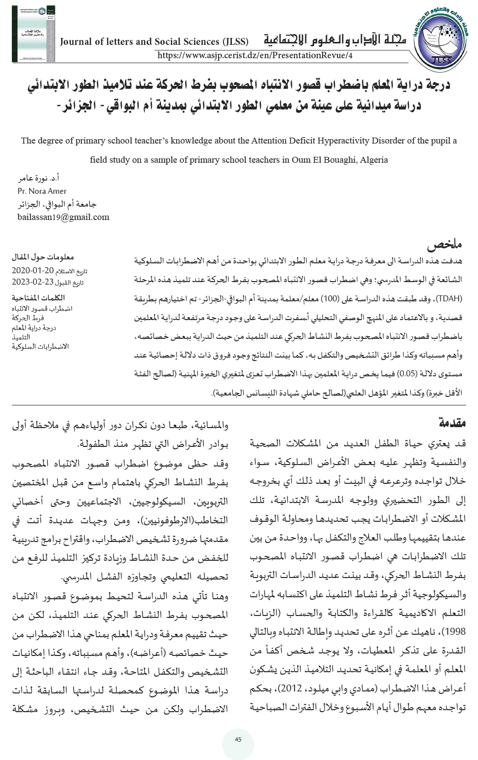 The degree of primary school teacher’s knowledge about the Attention Deficit Hyperactivity Disorder of the pupil a field study on a sample of primary school teachers in Oum El Bouaghi, Algeria