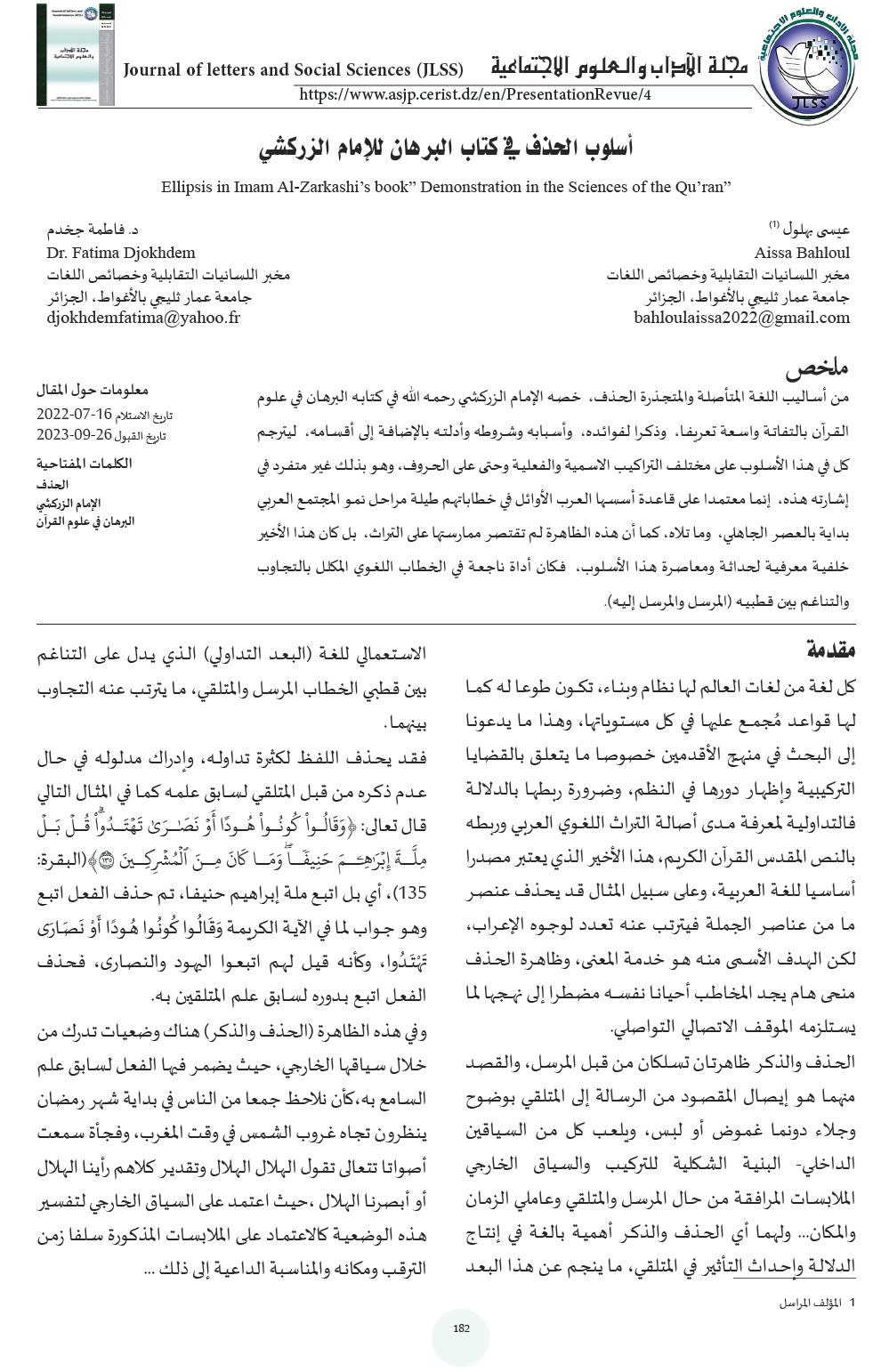 L’un des styles enracinés de langue arabe est l’ellipse que l’imam Al-Zarkashi a expliqué en détail dans son livre «Démonstration dans les sciences du Coran» en fournissant ses définitions et en mentionnant ses avantages, ses causes, ses conditions et ses preuves, ainsi que ses différents types. Tous ces aspects ont été complétés par un côté pratique de ce style sur différentes structures nominales et verbales, et même sur les lettres. Cependant, l’imam Al-Zarkashi n’a pas été le premier à faire référence à l’ellipse, mais s’est plutôt appuyé sur une base établie par les premiers Arabes dans leurs discours tout au long des étapes de la croissance de la société arabe, en commençant par l’ère préislamique et au-delà. Aussi, la pratique de ce phénomène ne se limitait pas à l’héritage, mais avait un bagage de connaissances pour rechercher la modernité et la contemporanéité de ce style par la réponse et l’harmonie entre ses pôles (le l’expéditeur et le destinataire).