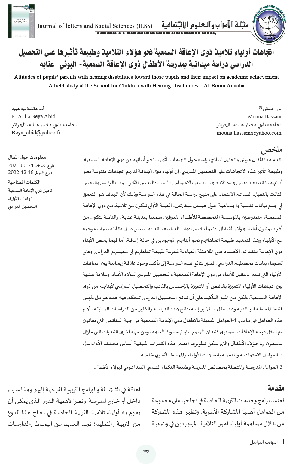 اتجاهات أولياء تلاميذ ذوي الإعاقة السمعية نحو هؤلاء التلاميذ وطبيعة تأثيرها على التحصيل الدراسي دراسة ميدانية بمدرسة الأطفال ذوي الإعاقة السمعية- البوني_عنابه