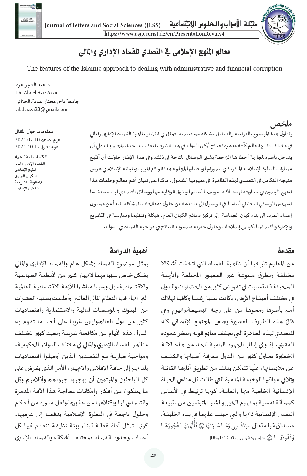 Azza, A. A. (2025). The features of the Islamic approach to dealing with administrative and financial corruption: Information about the article: Submission date 10-02-2021 *** Acceptance date 12-10-2021. Journal of Literature and Social Sciences, 19(02), 209–234. Retrieved from https://revues.univ-setif2.dz/index.php/jlss/article/view/192