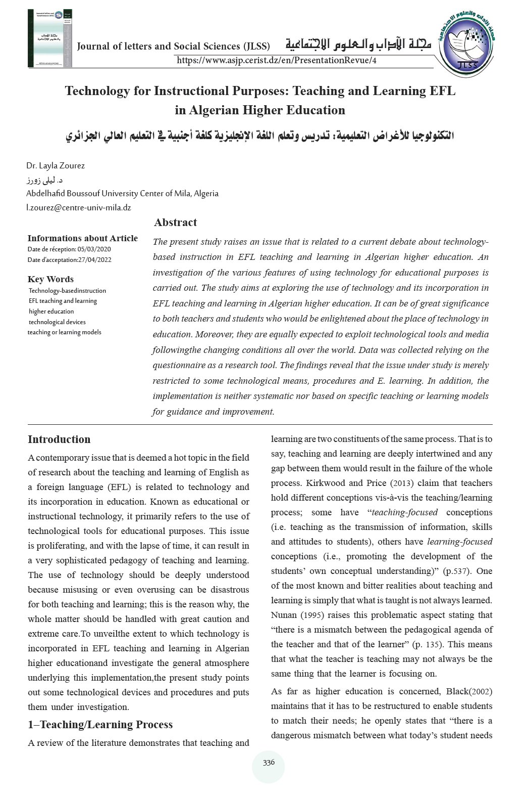 Technology for Instructional Purposes: Teaching and Learning EFL in Algerian Higher Education