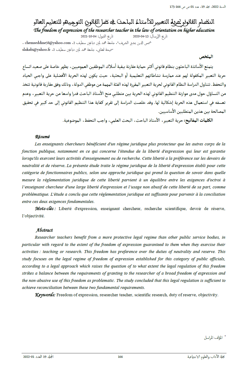 Les enseignants chercheurs bénéficient d'un régime juridique plus protecteur que les autres corps de la fonction publique, notamment en ce qui concerne l'étendue de la liberté d'expression qui leur est garantie lorsqu'ils exercent leurs activités d'enseignement ou de recherche. Cette liberté a la préférence sur les devoirs de neutralité et de réserve. La présente étude traite le régime juridique de la liberté d'expression établi pour cette catégorie de fonctionnaires publics, selon une approche juridique qui prend la question de savoir dans quelle mesure la réglementation juridique de cette liberté parvient à un équilibre entre les exigences d'octroi à l’enseignant chercheur d'une large liberté d'expression et l’usage non abusif de cette liberté de sa part, comme problématique. L'étude a conclu que cette réglementation juridique est suffisante pour parvenir à la conciliation entre ces deux exigences fondamentales.