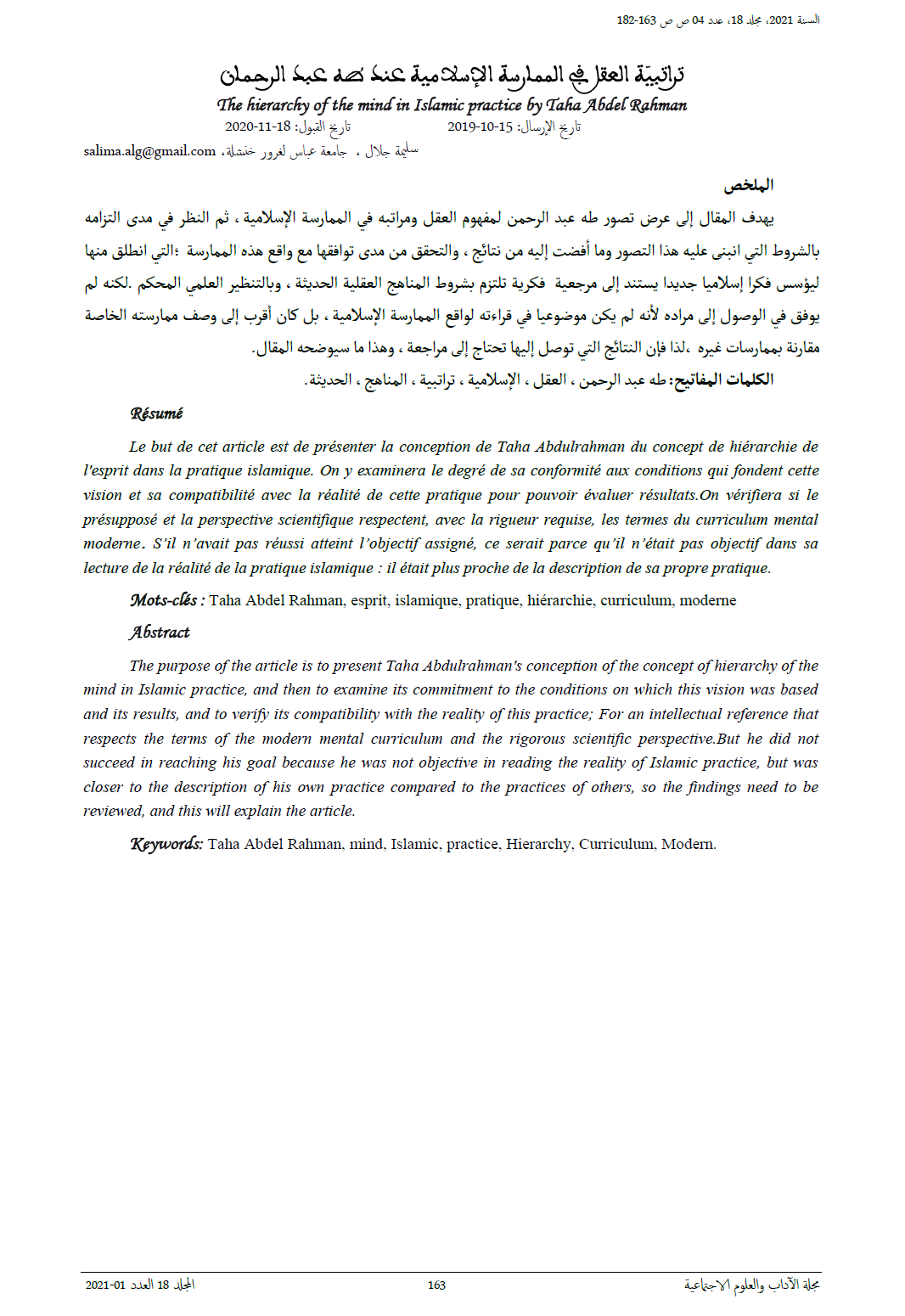جلال س. (2025). The hierarchy of the mind in Islamic practice by Taha Abdel Rahman: تاريخ الإرسال: 2019-10-15 ***** تاريخ القبول: 2020-11-18. Journal of Literature and Social Sciences, 18(01), 163–182. Retrieved from https://revues.univ-setif2.dz/index.php/jlss/article/view/230