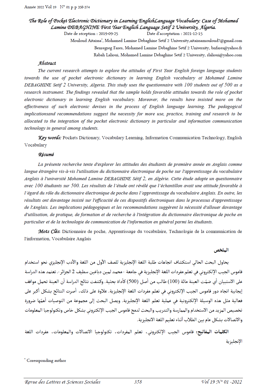 The current research attempts to explore the attitudes of First Year English foreign language students towards the use of pocket electronic dictionary in learning English vocabulary at Mohamed Lamine DEBAGHINE Setif 2 University, Algeria. This study uses the questionnaire with 100 students out of 500 as a research instrument. The findings revealed that the sample holds favorable attitudes towards the role of pocket electronic dictionary in learning English vocabulary. Moreover, the results have insisted more on the effectiveness of such electronic devises in the process of English language learning. The pedagogical implicationsand recommendations suggest the necessity for more use, practice, training and research to be allocated to the integration of the pocket electronic dictionary in particular and information communication technology in general among students.