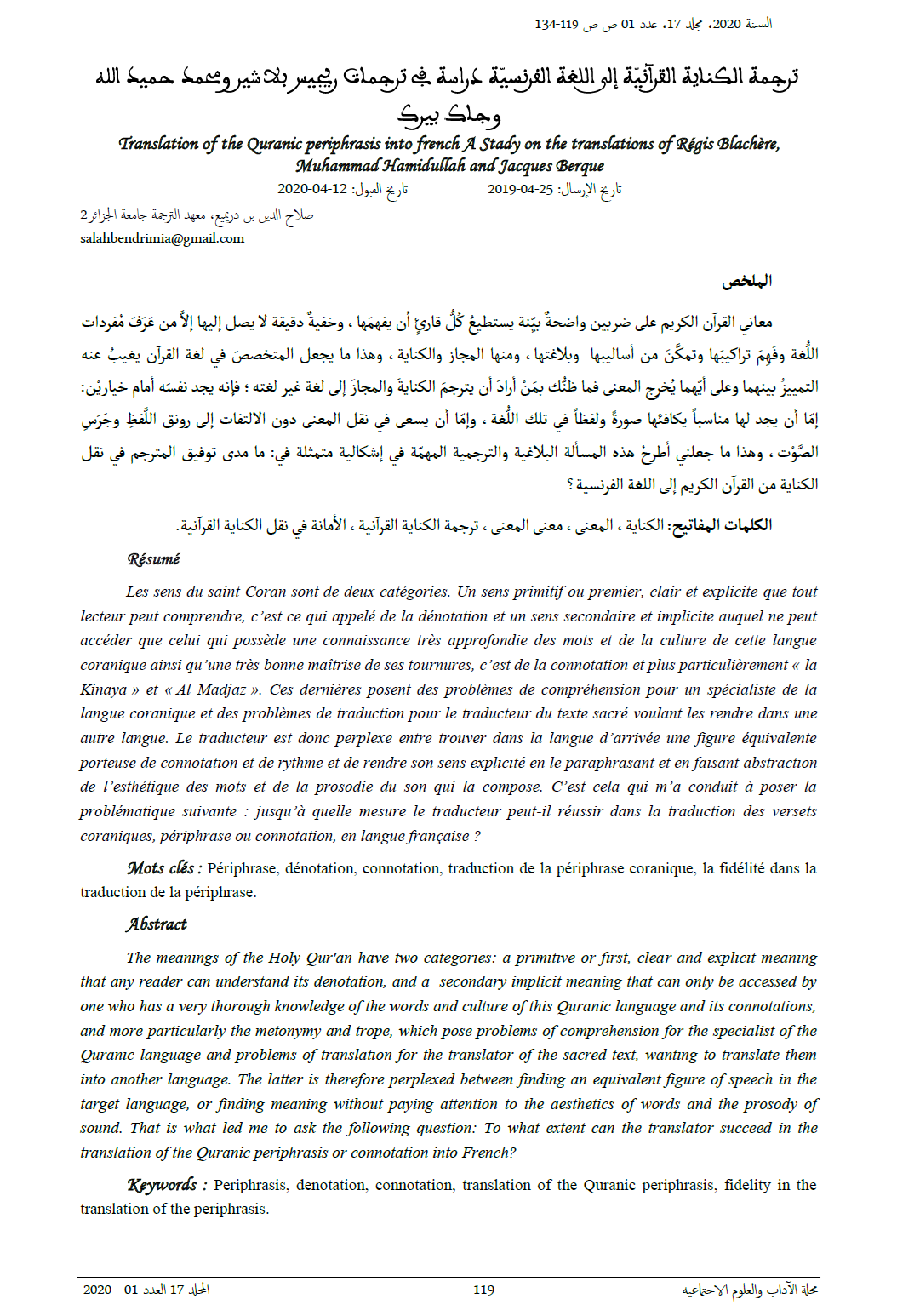 بن دريميع ص. ا. (2025). ترجمة الكناية القرآنيّة إلى اللغة الفرنسيّة دراسة في ترجمات ريجيس بلاشير ومحمد حميد الله وجاك بيرك: تاريخ الإرسال: 2019-04-25 تاريخ القبول: 12-04-2020. مجلة الآداب و العلوم الإجتماعية, 17(01), 119–134. استرجع في من https://revues.univ-setif2.dz/index.php/jlss/article/view/286