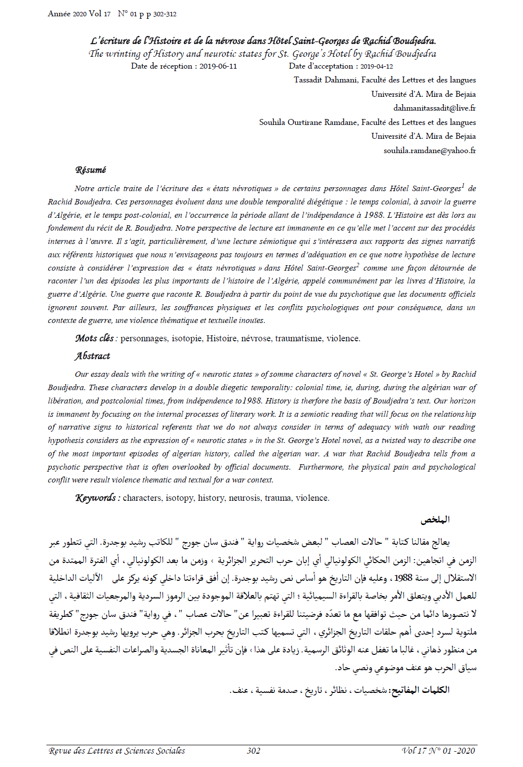 Our essay deals with the writing of « neurotic states » of somme characters of novel « St. George’s Hotel » by Rachid Boudjedra. These characters develop in a double diegetic temporality: colonial time, ie, during, during the algérian war of libération, and postcolonial times, from indépendence to1988. History is therfore the basis of Boudjedra’s text. Our horizon is immanent by focusing on the internal processes of literary work. It is a semiotic reading that will focus on the relationship of narrative signs to historical referents that we do not always consider in terms of adequacy with wath our reading hypothesis considers as the expression of « neurotic states » in the St. George’s Hotel novel, as a twisted way to describe one of the most important episodes of algerian history, called the algerian war. A war that Rachid Boudjedra tells from a psychotic perspective that is often overlooked by official documents.  Furthermore, the physical pain and psychological conflit were result violence thematic and textual for a war context.