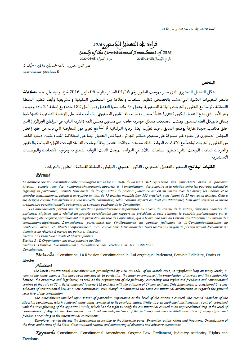 The latest Constitutional Amendment was promulgated by Law No.16/01 of 06 March 2016, is significant leap on many levels, in view of the many changes that have been introduced. In particular, the latter encompassed the organization of powers and the relationship between the executive and legislative, as well as the organization of the judiciary, coinciding with rights and freedoms and constitutional control at the rate of 73 articles amended (among 182 articles) with the addition of 27 new articles. This Amendment is considered by some scholars of constitutional law as a new constitution, even though it maintained the same constitutional architecture as regards the general structure of the constitution.