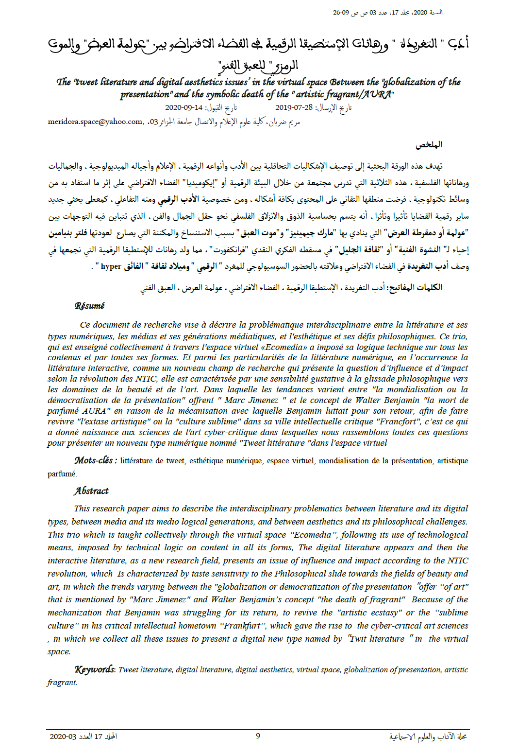 Ce document de recherche vise à décrire la problématique interdisciplinaire entre la littérature et ses types numériques, les médias et ses générations médiatiques, et l'esthétique et ses défis philosophiques. Ce trio, qui est enseigné collectivement à travers l'espace virtuel «Ecomedia» a imposé sa logique technique sur tous les contenus et par toutes ses formes. Et parmi les particularités de la littérature numérique, en l’occurrence la littérature interactive, comme un nouveau champ de recherche qui présente la question d’influence et d’impact selon la révolution des NTIC, elle est caractérisée par une sensibilité gustative à la glissade philosophique vers les domaines de la beauté et de l’art. Dans laquelle les tendances varient entre "la mondialisation ou la démocratisation de la présentation" offrent " Marc Jimenez " et le concept de Walter Benjamin "la mort de parfumé AURA" en raison de la mécanisation avec laquelle Benjamin luttait pour son retour, afin de faire revivre "l'extase artistique" ou la "culture sublime" dans sa ville intellectuelle critique "Francfort", c’est ce qui a donné naissance aux sciences de l'art cyber-critique dans lesquelles nous rassemblons toutes ces questions pour présenter un nouveau type numérique nommé "Tweet littérature "dans l'espace virtuel