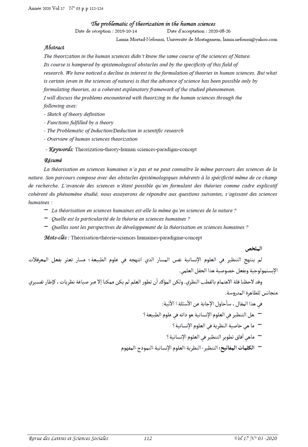 Mortad-Nefoussi, L. (2025). The problematic of theorization in the human sciences: Date de réception : 2019-10-14 Date d’acceptation : 2020-08-26. مجلة الآداب و العلوم الإجتماعية, 17(03), 112–124. استرجع في من https://revues.univ-setif2.dz/index.php/jlss/article/view/320