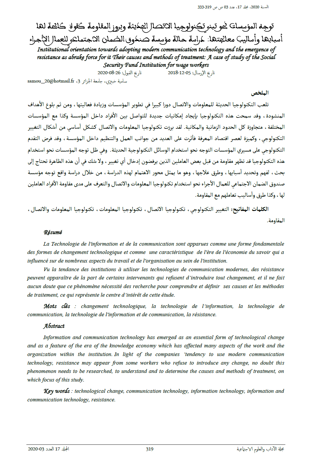 تلعب التكنولوجيا الحديثة للمعلومات والاتصال دورا كبيرا في تطوير المؤسسات وزيادة فعاليتها،ومن ثم بلوغ الأهداف المنشودة، وقدسمحت هذه التكنولوجيا بإيجاد إمكانيات جديدة للتواصل بين الأفراد داخل المؤسسة وكذا مع المؤسسات المختلفة، متجاوزةكل الحدود الزمانية والمكانية. لقد برزت تكنولوجيا المعلومات والاتصال كشكل أساسي من أشكال التغيير التكنولوجي،وكميزة لعصر اقتصادالمعرفة فأثرتعلى العديد من جوانب العمل والتنظيم داخل المؤسسة،وقد فرض التقدم التكنولوجي على مسيري المؤسسات التوجه نحو استخدام الوسائل التكنولوجية الحديثة. وفيظل توجه المؤسسات نحو استخدام هذه التكنولوجيا قد تظهر مقاومة من قبل بعض العاملين الذين يرفضون إدخال أي تغيير، ولا شك في أن هذه الظاهرة تحتاج إلى بحث، لفهم وتحديد أسبابها، وطرق علاجها، وهو ما يمثل محور الاهتمام لهذه الدراسة، من خلالدراسة واقع توجه مؤسسة صندوق الضمان الاجتماعي للعمال الأجراء نحو استخدام تكنولوجيا المعلومات والاتصال والتعرفعلى مدى مقاومة الأفراد العاملين لها، وكذا طرق وأساليب تعاملهم مع المقاومة.