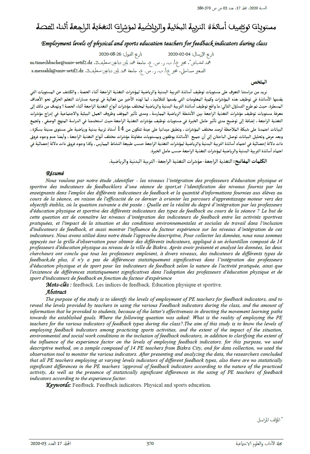 Nous voulons par notre étude ,identifier - les niveaux l’intégration des professeurs d'éducation physique et sportive des indicateurs de feedbacklors d’une séance de sport,et l’identification des niveaux fournis par les enseignants dans l'emploi des différents indicateurs de feedback et la quantité d'informations fournies aux élèves au cours de la séance, en raison de l'efficacité de ce dernier à orienter les parcours d'apprentissage moteur vers des objectifs établis, où la question suivante a été posée : Quelle est la réalité du degré d’intégration par les professeurs d'éducation physique et sportive des différents indicateurs des types de feedback au cours de la séance ? Le but de cette question est de connaître les niveaux d’intégration des indicateurs de feedback entre les activités sportives pratiquées, et l'impact de la situation et des conditions environnementales et sociales de travail dans l'inclusion d'indicateurs de feedback, et aussi montrer l'influence du facteur expérience sur les niveaux d’intégration de ces indicateurs. Nous avons utilisé dans notre étude l'approche descriptive, Pour collecter les données, nous nous sommes appuyés sur la grille d'observation pour obtenir des différents indicateurs, appliqué à un échantillon composé de 14 professeurs d'éducation physique au niveau de la ville de Biskra. Après avoir présenté et analysé les données, les deux chercheurs ont conclu que tous les professeurs emploient, à divers niveaux, des indicateurs de différents types de feedback,de plus, il n'y a pas de différences statistiquement significatives dans l’intégration des professeurs d'éducation physique et de sport pour les indicateurs de feedback selon la nature de l'activité pratiquée, ainsi que l'existence de différences statistiquement significatives dans l'adoption des professeurs d'éducation physique et de sport d'indicateurs de feedback en fonction du facteur d'expérience