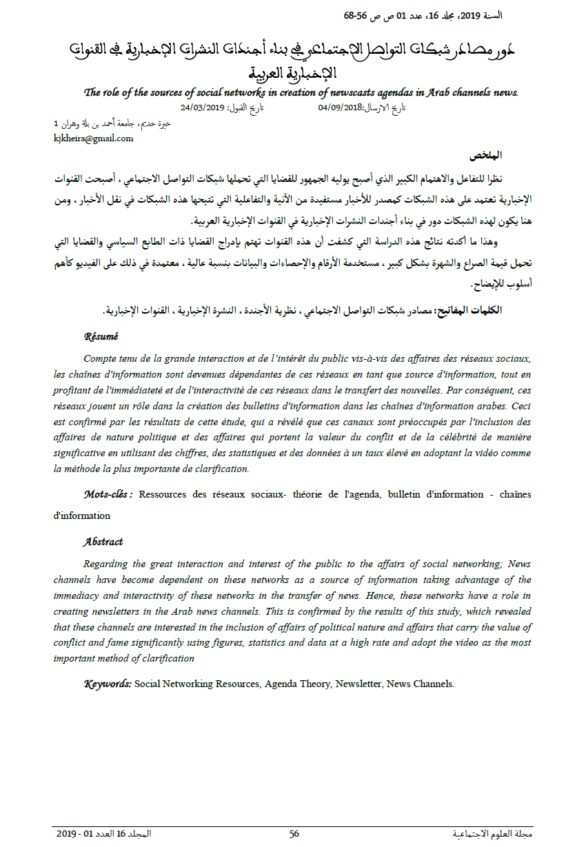 خديم خ. (2019). The role of the sources of social networks in creation of newscasts agendas in Arab channels news.: تاريخ الارسال: 04/09/2018 تاريخ القبول: 24/03/2019. Journal of Literature and Social Sciences, 16(01), 56–68. Retrieved from https://revues.univ-setif2.dz/index.php/jlss/article/view/355