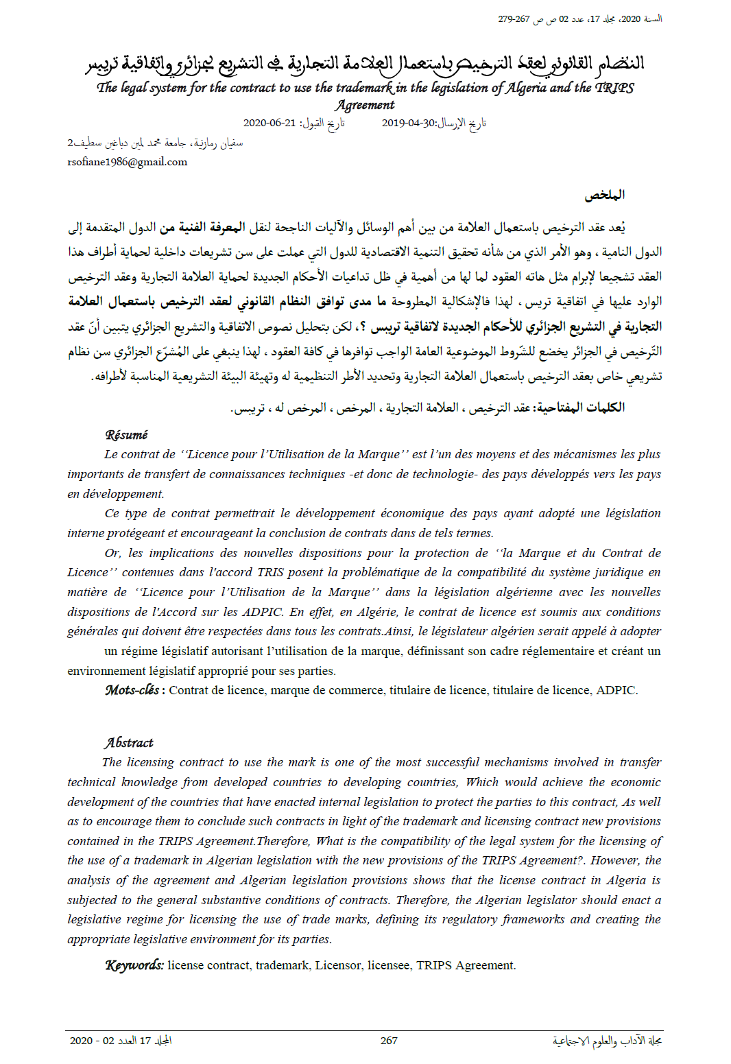 The licensing contract to use the mark is one of the most successful mechanisms involved in transfer technical knowledge from developed countries to developing countries, Which would achieve the economic development of the countries that have enacted internal legislation to protect the parties to this contract, As well as to encourage them to conclude such contracts in light of the trademark and licensing contract new provisions contained in the TRIPS Agreement.Therefore, What is the compatibility of the legal system for the licensing of the use of a trademark in Algerian legislation with the new provisions of the TRIPS Agreement?. However, the analysis of the agreement and Algerian legislation provisions shows that the license contract in Algeria is subjected to the general substantive conditions of contracts. Therefore, the Algerian legislator should enact a legislative regime for licensing the use of trade marks, defining its regulatory frameworks and creating the appropriate legislative environment for its parties.