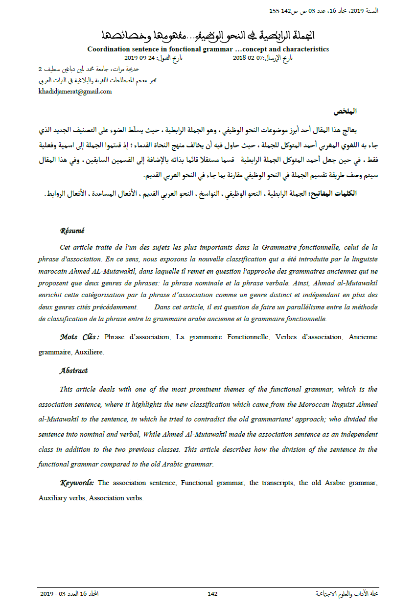 مرات خ. (2025). Coordination sentence in fonctional grammar …concept and characteristics: تاريخ الإرسال: 2018-02-07 تاريخ القبول: 2019-09-24. Journal of Literature and Social Sciences, 16(03), 142–155. Retrieved from https://revues.univ-setif2.dz/index.php/jlss/article/view/450