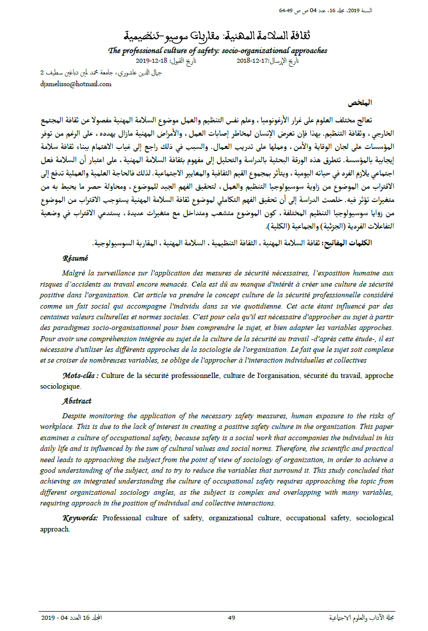 Culture de la sécurité professionnelle، culture de l'organisation، sécurité du travail، approche sociologiqueالملخص