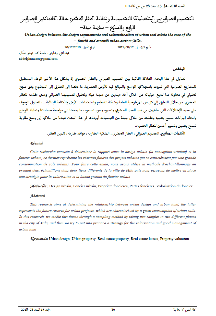 التصميم العمراني، العقار الحضري، الملكية العقارية، فواقد عقارية، تثمين العقارFrançais