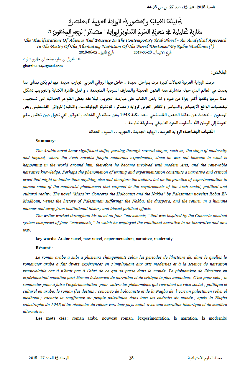 بن يطو م. ا. (2018). تجليّات الغياب والحضور في الرّواية العربية المعاصرة مقاربة تحليلية في شعريّة السّرد التّناوبيّ لرواية " مصائر " لربعي المدهون: تاريخ الارسال: 2017-06-28 تاريخ القبول: 2018-06-05. مجلة الآداب و العلوم الإجتماعية, 15(03), 38–44. استرجع في من https://revues.univ-setif2.dz/index.php/jlss/article/view/668