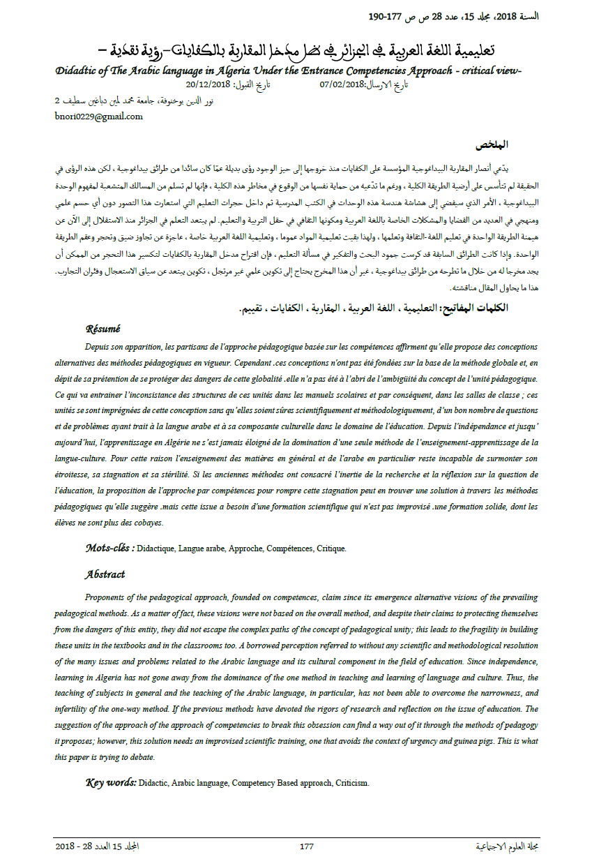 Didadtic of The Arabic language in Algeria Under the Entrance Competencies Approach - critical view-