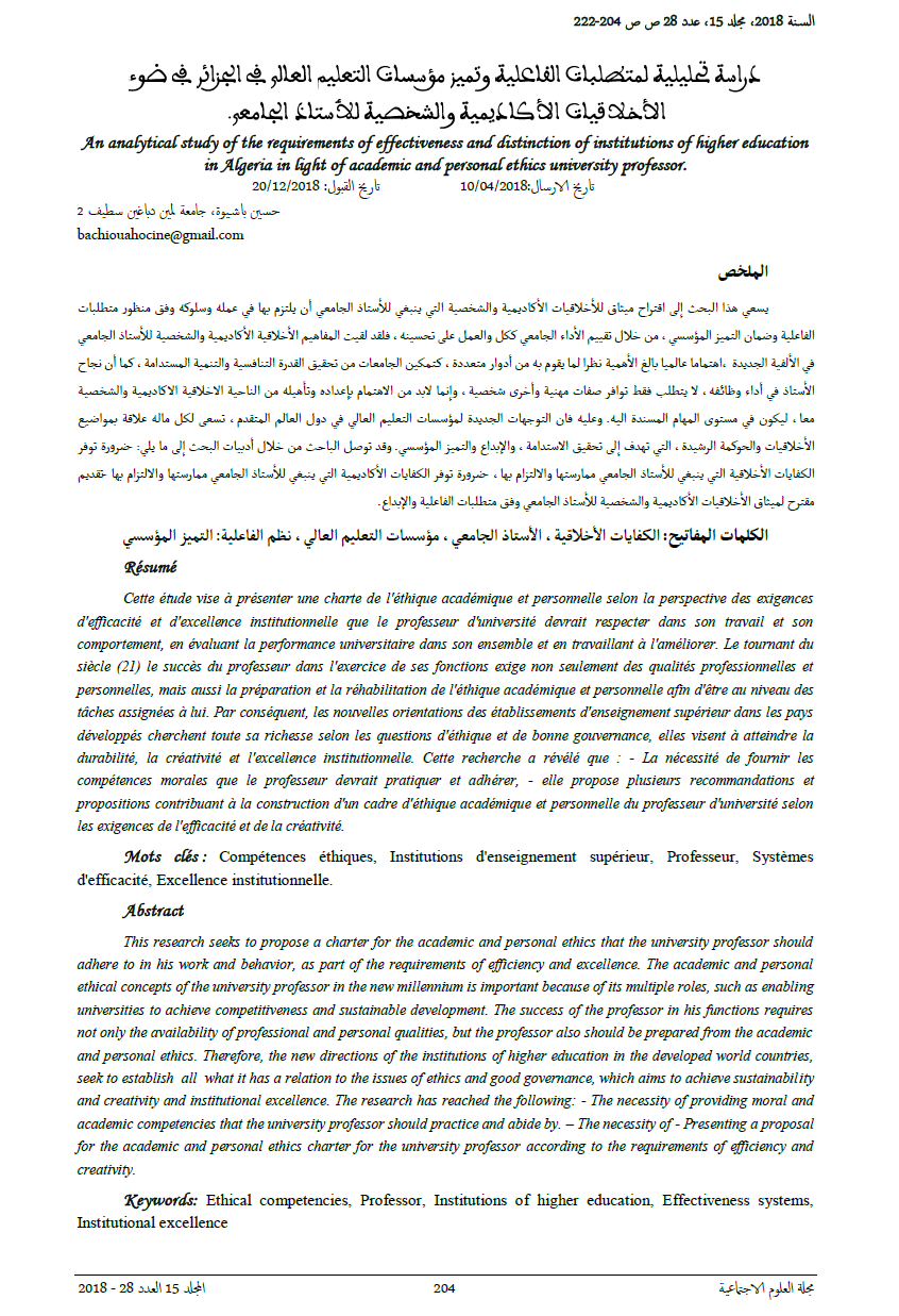 دراسة تحليلية لمتطلبات الفاعلية وتميز مؤسسات التعليم العالي في الجزائر في ضوء الأخلاقيات الأكاديمية والشخصية للأستاذ الجامعي.