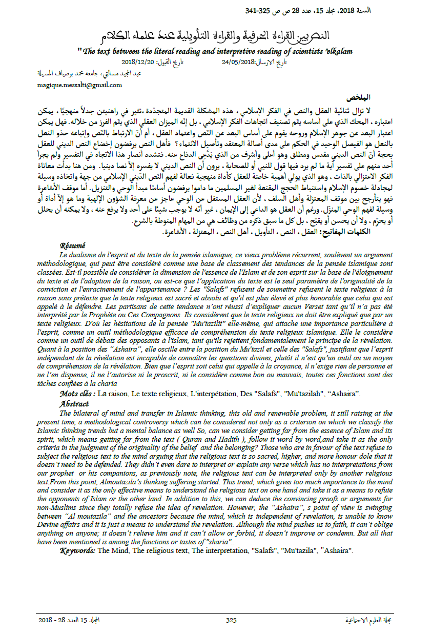 The bilateral of mind and transfer in Islamic thinking, this old and renewable problem, it still raising at the present time, a methodological controversy which can be considered not only as a criterion on which we classify the Islamic thinking trends but a mental balance as well So, can we consider getting far from the essence of Islam and its spirit, which means getting far from the text ( Quran and Hadith ), follow it word by word,and take it as the only criteria in the judgment of the originality of the belief  and the belonging? Those who are in favour of the text refuse to subject the religious text to the mind arguing that the religious text is so sacred, higher, and more honour dole that it doesn’t need to be defended. They didn’t even dare to interpret or explain any verse which has no interpretations from our prophet  or his companions, as previously note, the religious text can be interpreted only by another religious text.From this point, Almoutazila‘s thinking suffering started. This trend, which gives too much importance to the mind and consider it as the only effective means to understand the religious text on one hand and take it as a means to refute the opponents of Islam or the other land. In addition to this, we can deduce the convincing proofs or arguments for non-Muslims since they totally refuse the idea of revelation. However, the “Ashaira”, s point of view is swinging between “Al moutazila” and the ancestors because the mind, which is independent of revelation, is unable to know Devine affairs and it is just a means to understand the revelation. Although the mind pushes us to faith, it can’t oblige anything on anyone; it doesn’t relieve him and it can’t allow or forbid, it doesn’t improve or condemn. But all that have been mentioned is among the functions or tastes of "sharia"..