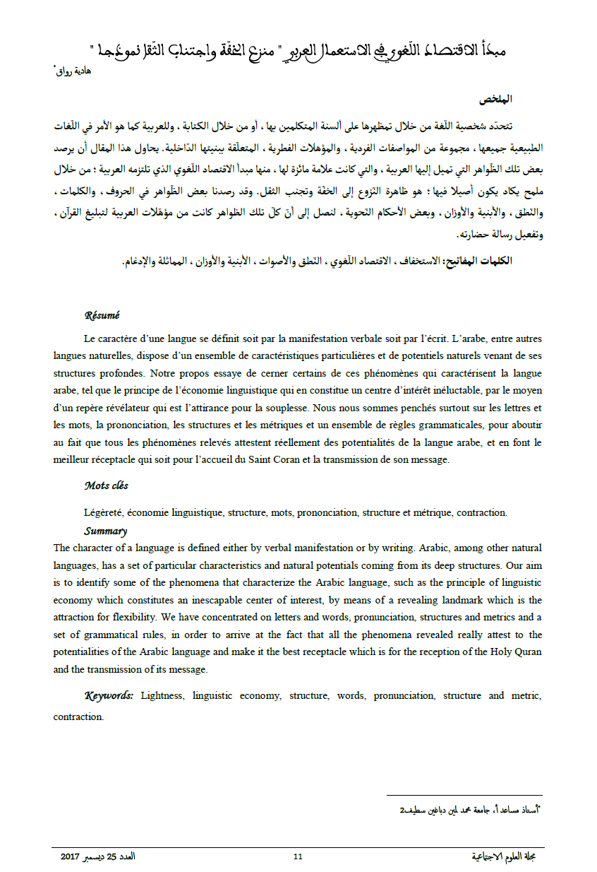 Le caractère d’une langue se définit soit par la manifestation verbale soit par l’écrit. L’arabe, entre autres langues naturelles, dispose d’un ensemble de caractéristiques particulières et de potentiels naturels venant de ses structures profondes. Notre propos essaye de cerner certains de ces phénomènes qui caractérisent la langue arabe, tel que le principe de l’économie linguistique qui en constitue un centre d’intérêt inéluctable, par le moyen d’un repère révélateur qui est l’attirance pour la souplesse. Nous nous sommes penchés surtout sur les lettres et les mots, la prononciation, les structures et les métriques et un ensemble de règles grammaticales, pour aboutir au fait que tous les phénomènes relevés attestent réellement des potentialités de la langue arabe, et en font le meilleur réceptacle qui soit pour l’accueil du Saint Coran et la transmission de son message.