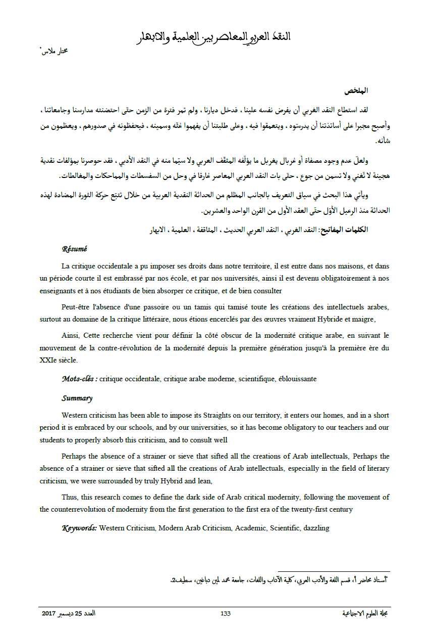 La critique occidentale a pu imposer ses droits dans notre territoire, il est entre dans nos maisons, et dans un période courte il est embrassé par nos école, et par nos universités, ainsi il est devenu obligatoirement à nos enseignants et à nos étudiants de bien absorper ce critique, et de bien consulter Peut-être l'absence d'une passoire ou un tamis qui tamisé toute les créations des intellectuels arabes, surtout au domaine de la critique littéraire, nous étions encerclés par des œuvres vraiment Hybride et maigre, Ainsi, Cette recherche vient pour définir la côté obscur de la modernité critique arabe, en suivant le mouvement de la contre-révolution de la modernité depuis la première génération jusqu'à la première ère du XXIe siècle.