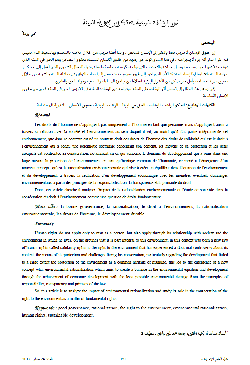 إذن يسعى هذا المقال إلى تحليل أثر الرشادة على البيئة،ودراسة دور الرشادة البيئية في تكريس الحق في البيئة كحق من حقوق الإنسان الأساسية.