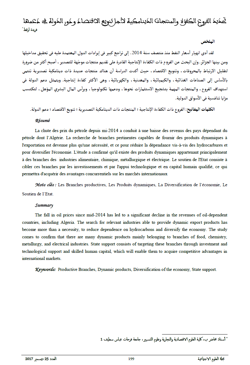 La chute des prix du pétrole depuis mi-2014a conduit à une baisse des revenus des pays dépendant du pétrole dont l’Algérie. La recherche de branches pertinentes capables de fournir des produits dynamiques à l'exportation est devenue plus qu'une nécessité, et ce pour réduire la dépendance vis-à-vis des hydrocarbures et pour diversifier l'économie. L'étude a confirmé qu'il existe des produits dynamiques appartenant principalement à des branches des industries alimentaire, chimique, métallurgique et électrique. Le soutien de l'Etat consiste à cibler ces branches par les investissements et par l'appui technologique et en capital humain qualifié, ce qui permettra d'acquérir des avantages concurrentiels sur les marchés internationaux