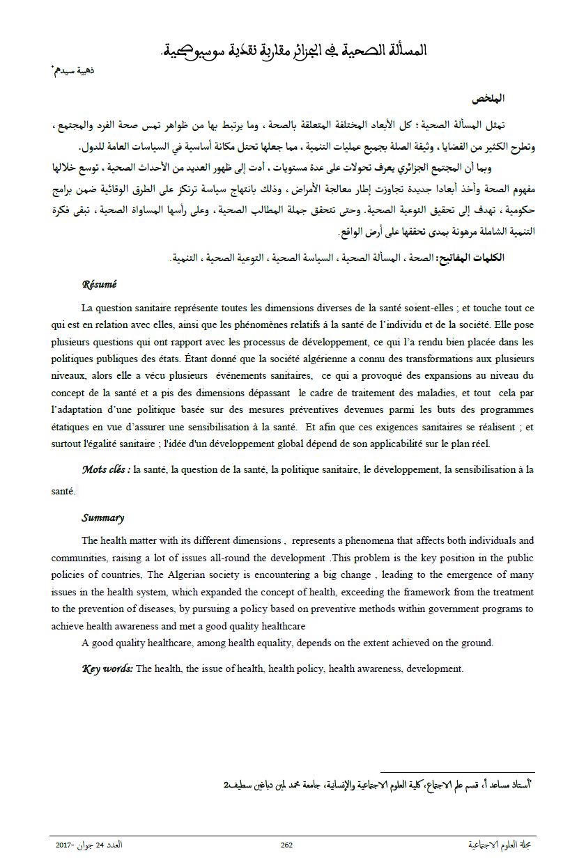 La question sanitaire représente toutes les dimensions diverses de la santé soient-elles ;et touche tout ce qui est en relation avec elles, ainsi que les phénomènes relatifs á la santé de l’individu et de la société. Elle pose plusieurs questions qui ont rapport avec les processus de développement, ce qui l’a rendu bien placée dans les politiques publiques des états. Étant donné que la société algérienne a connu des transformations aux plusieurs niveaux, alors elle a vécu plusieurs événements sanitaires, ce qui a provoqué des expansions au niveau du concept de la santé et a pis des dimensions dépassant le cadre de traitement des maladies, et tout cela par l’adaptation d’une politique basée sur des mesures préventives devenues parmi les buts des programmes étatiques en vue d’assurer une sensibilisation à la santé. Et afin que ces exigences sanitaires se réalisent ; et surtout l'égalité sanitaire ; l'idée d'un développement global dépend de son applicabilité sur le plan réel.