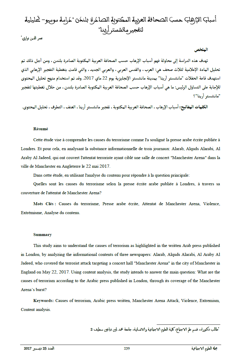 Cette étude vise à comprendre les causes du terrorisme comme l'a souligné la presse arabe écrite publiée à Londres. Et pour cela, en analysant la substance informationnelle de trois journaux: Alarab, Alquds Alarabi, Al Araby Al Jadeed,qui ont couvert l'attentat terroriste ayant ciblé une salle de concert "Manchester Arena"dans la ville de Manchester en Angleterre le 22 mai 2017.