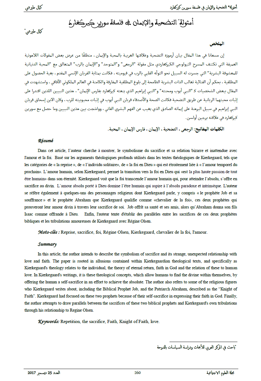 Dans cet article, l’auteur cherche à montrer, le symbolisme du sacrifice et sa relation bizarre et inattendue avec l'amour et la foi. Basé sur les arguments théologiques profonds utilisés dans les textes théologiques de Kierkegaard, tels que les catégories de « la reprise », de « l’individu solitaire», de « la foi en Dieu » qui est étroitement liée à « l’amour temporel du prochain». L’amour humain, selon Kierkegaard, permet la transition vers la foi en Dieu qui «est la plus haute passion de tout être humain» dans son éternité. Kierkegaard voit que la foi transcende l’amour humain qui, pour atteindre l’absolu, s’offre en sacrifice au divin. L’amour absolu porté à Dieu domine l’être humain qui aspire à l’absolu paradoxe et intrinsèque. L'auteur se réfère également à quelques-uns des personnages religieux dont Kierkegaard parle, y compris « le prophète Job et sa souffrance » et le prophète Abraham que Kierkegaard qualifie comme «chevalier de la foi», ces deux prophètes qui prouveront leur amour divin à travers leur sacrifice de soi. Job offrît sa santé et ses amis, alors qu’Abraham donna son fils Isaac comme offrande à Dieu. Enfin, l'auteur tente d'établir des parallèles entre les sacrifices de ces deux prophètes bibliques et les tribulations amoureuses de Kierkegaard avec Régine Olsen.