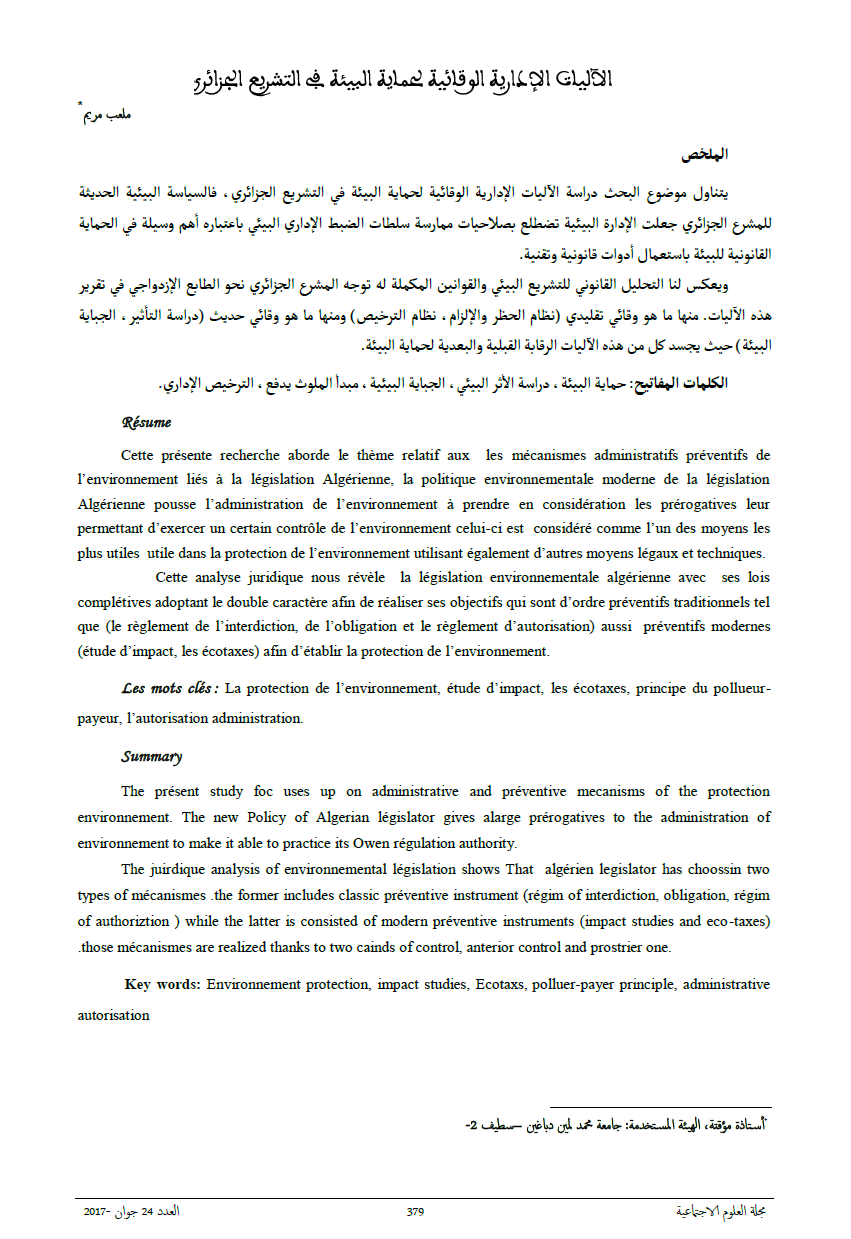 cette présente recherche abordele thème relatif aux  les mécanismes administratifs préventifs de l’environnement liés à la législation Algérienne, la politique environnementale moderne de la législation Algérienne pousse l’administration de l’environnement à prendre en considération les prérogatives leur permettant d’exercer un certain contrôle de l’environnement celui-ci est  considéré comme l’un des moyens les plus utiles  utile dans la protection de l’environnement utilisant également d’autres moyens légaux et techniques.