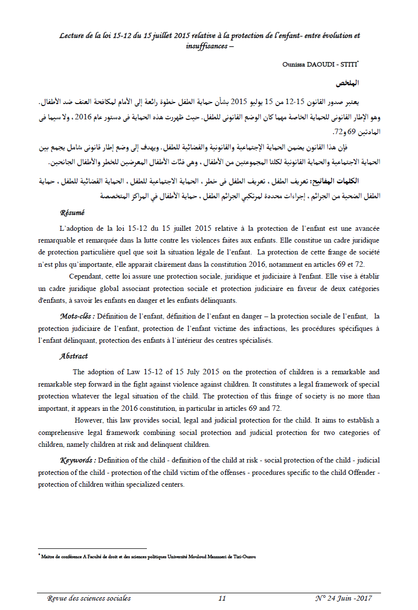 Lecture de la loi 15-12 du 15 juillet 2015 relative à la protection de l’enfant- entre évolution et insuffisances –