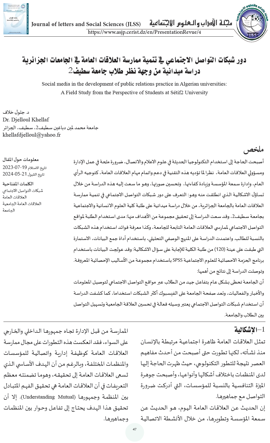 The need to use modern technology in the field of media and communication sciences has become essential for management and public relations professionals, due to the role this technology plays in supporting and completing the tasks of public relations, such as shaping public opinion, managing the institution’s reputation, increasing its efficiency, and improving its image. This is what this study aimed to achieve through addressing the problem statement: identifying the role of social media networks in developing public relations practice at Algerian universities, through a field study on students of the Faculty of Humanities and Social Sciences at Setif 2 University.