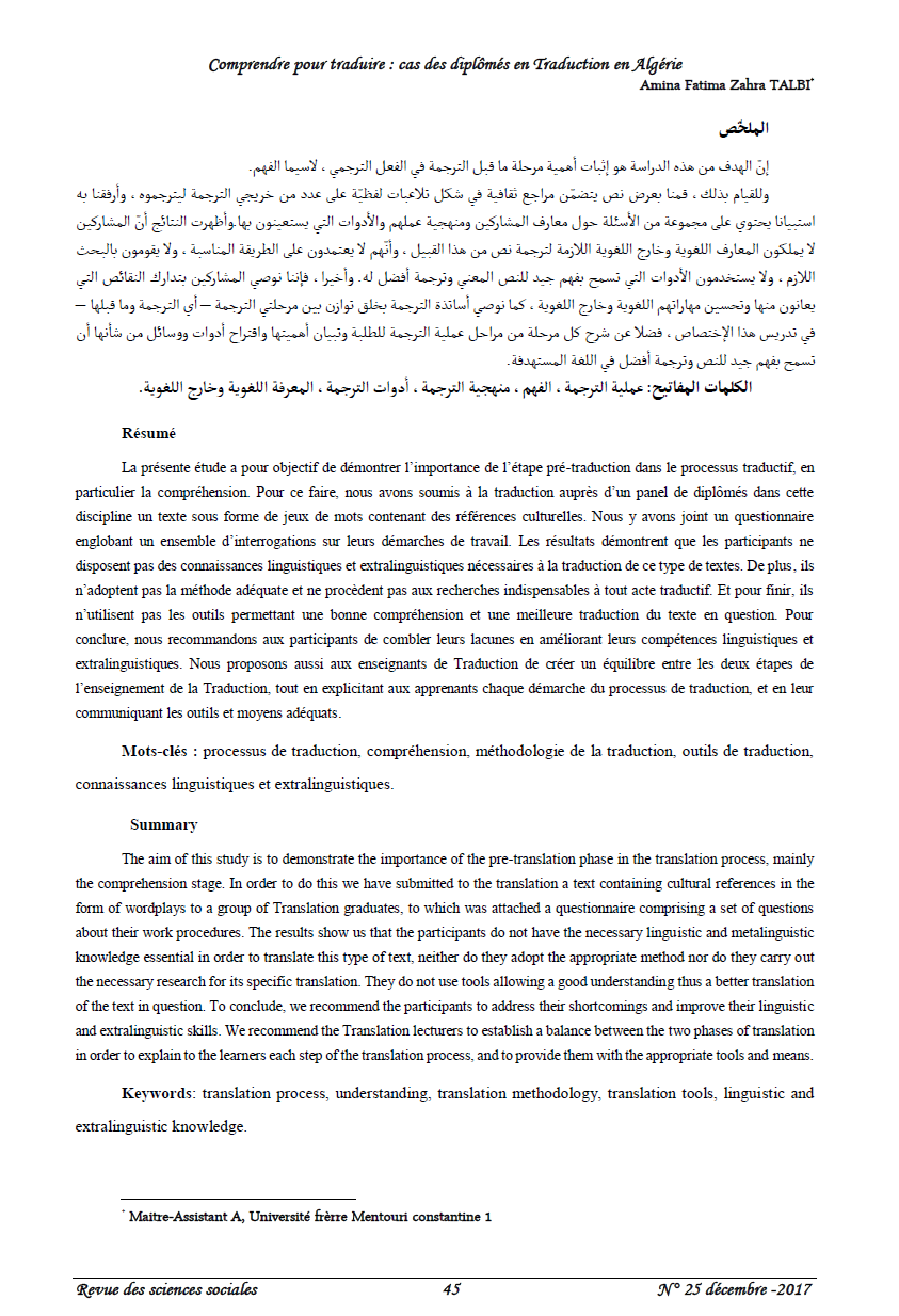 La présente étude a pour objectif de démontrer l’importance de l’étape pré-traduction dans le processus traductif, en particulier la compréhension. Pour ce faire, nous avons soumis à la traduction auprès d’un panel de diplômés dans cette discipline un texte sous forme de jeux de mots contenant des références culturelles. Nous y avons joint un questionnaire englobant un ensemble d’interrogations sur leurs démarches de travail. Les résultats démontrent que les participants ne disposent pas des connaissances linguistiques et extralinguistiques nécessaires à la traduction de ce type de textes. De plus, ils n’adoptent pas la méthode adéquate et ne procèdent pas aux recherches indispensables à tout acte traductif. Et pour finir, ils n’utilisent pas les outils permettant une bonne compréhension et une meilleure traduction du texte en question. Pour conclure, nous recommandons aux participants de combler leurs lacunes en améliorant leurs compétences linguistiques et extralinguistiques. Nous proposons aussi aux enseignants de Traduction de créer un équilibre entre les deux étapes de l’enseignement de la Traduction, tout en explicitant aux apprenants chaque démarche du processus de traduction, et en leur communiquant les outils et moyens adéquats.