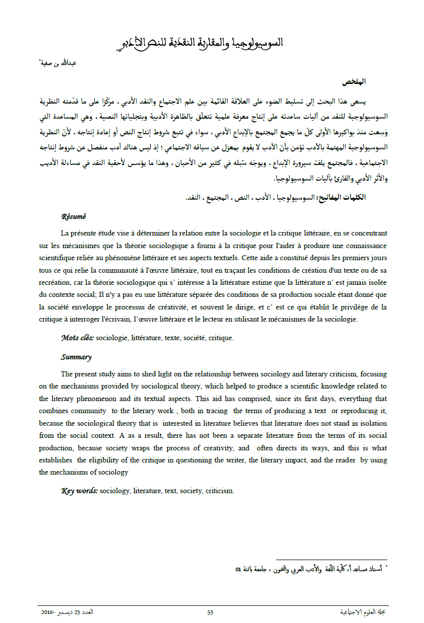La présente étude vise à déterminer la relation entre la sociologie et la critique littéraire, en se concentrant sur les mécanismes que la théorie sociologique a fourni à la critique pour l'aider à produire une connaissance scientifique reliée au phénomène littéraire et ses aspects textuels. Cette aide a constitué depuis les premiers jours  tous ce qui relie la communauté à l'œuvre littéraire, tout en traçant les conditions de création d'un texte ou de sa recréation, car la théorie sociologique qui s’ intéresse à la littérature estime que la littérature n’ est jamais isolée du contexte social; Il n'y a pas eu une littérature séparée des conditions de sa production sociale étant donné que la société enveloppe le processus de créativité, et souvent le dirige, et c’ est ce qui établit le privilège de la critique à interroger l'écrivain, l’œuvre littéraire et le lecteur en utilisant le mécanismes de la sociologie.