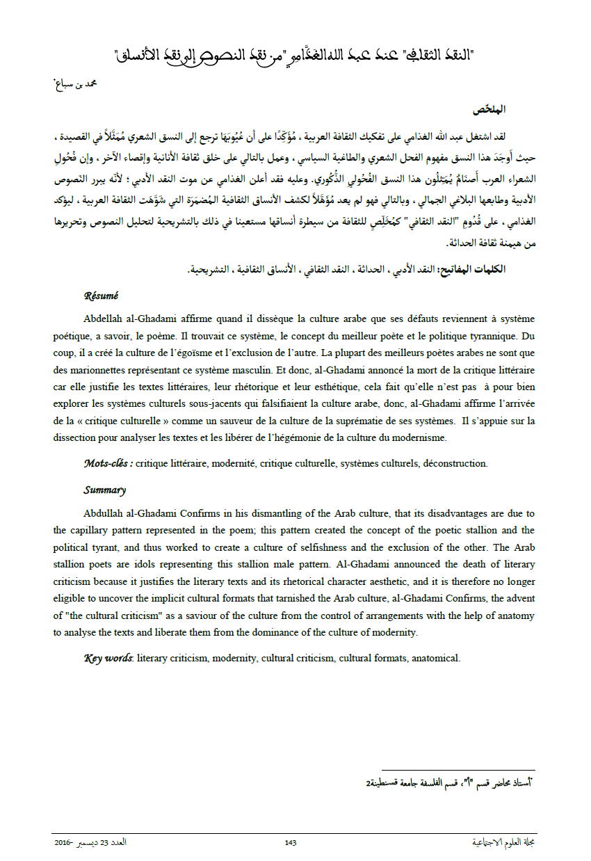 النقد الأدبي، الحداثة، النقد الثقافي، الأنساق الثقافية، التشريحيةFrançais