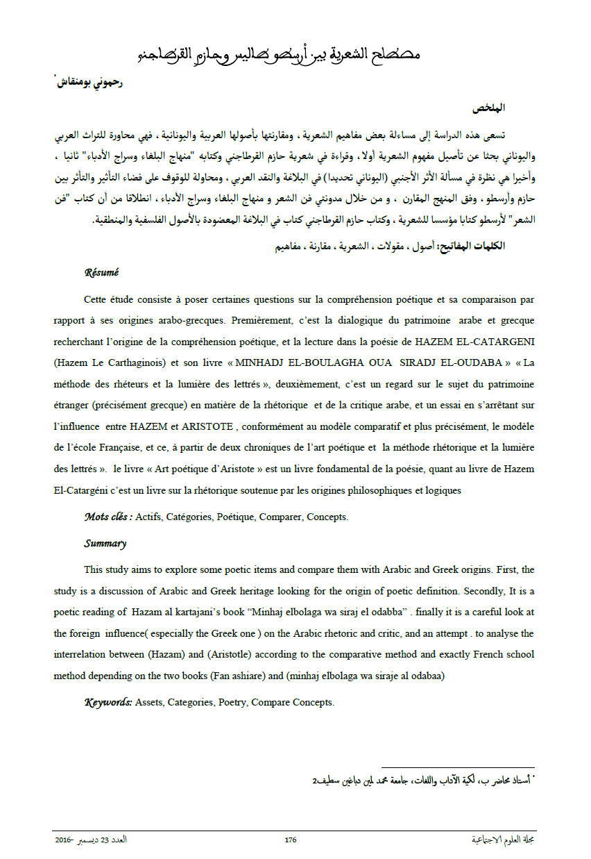 Cette étude consiste à poser certaines questions sur la compréhension poétique et sa comparaison par rapport à ses origines arabo-grecques. Premièrement, c’est la dialogique du patrimoine  arabe et grecque recherchant l’origine de la compréhension poétique, et la lecture dans la poésie de HAZEM EL-CATARGENI (Hazem Le Carthaginois) et son livre « MINHADJ EL-BOULAGHA OUA  SIRADJ EL-OUDABA » « La méthode des rhéteurs et la lumière des lettrés », deuxièmement, c’est un regard sur le sujet du patrimoine étranger (précisément grecque) en matière de la rhétorique  et de la critique arabe, et un essai en s’arrêtant sur l’influence  entre HAZEM et ARISTOTE , conformément au modèle comparatif et plus précisément, le modèle de l’école Française, et ce, à partir de deux chroniques de l’art poétique et  la méthode rhétorique et la lumière des lettrés ».  le livre « Art poétique d’Aristote » est un livre fondamental de la poésie, quant au livre de Hazem El-Catargéni c’est un livre sur la rhétorique soutenue par les origines philosophiques et logiques