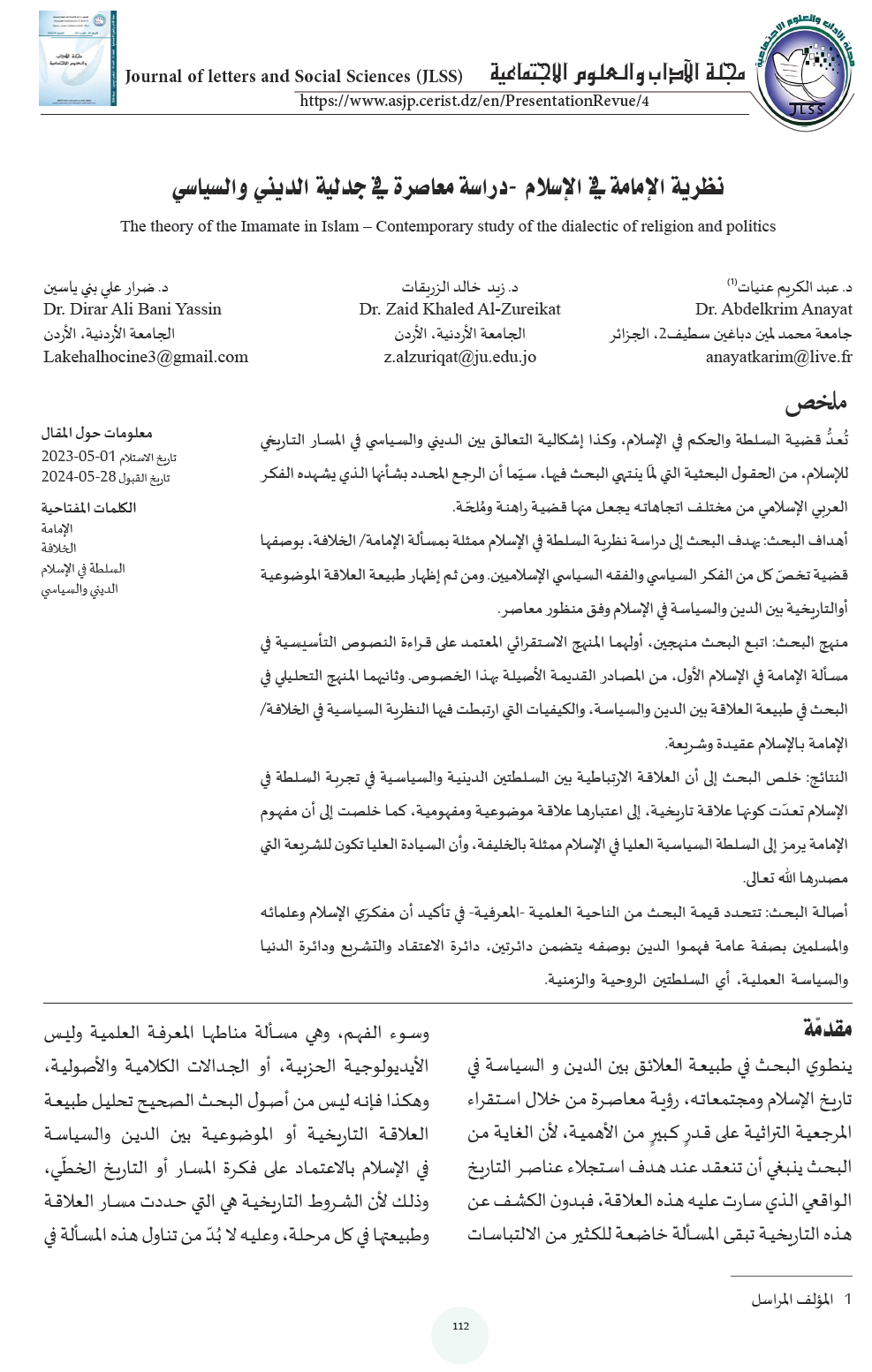عنيات ع. ا., الزريقات ز. . خ., & بني ياسين ض. ع. (2024). نظرية الإمامة في الإسلام -دراسة معاصرة في جدلية الديني والسياسي: معلومات حول المقال: تاريخ الاستلام 2023-05-01 ***** تاريخ القبول 28-05-2024. مجلة الآداب و العلوم الإجتماعية, 21(02), 112–126. استرجع في من https://revues.univ-setif2.dz/index.php/jlss/article/view/92