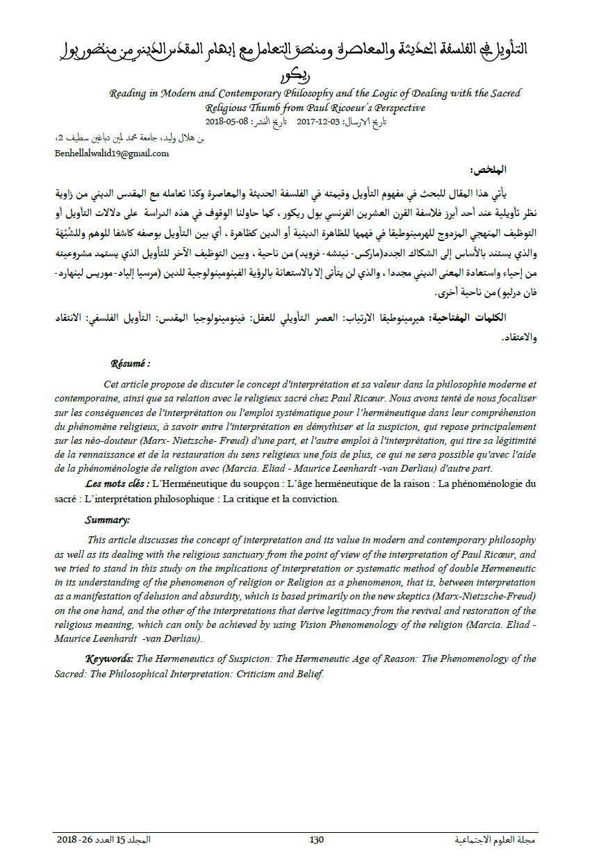 This article discusses the concept of interpretation and its value in modern and contemporary philosophy as well as its dealing with the religious sanctuary from the point of view of the interpretation of Paul Ricœur, and we tried to stand in this study on the implications of interpretation or systematic method of double Hermeneutic in its understanding of the phenomenon of religion or Religion as a phenomenon, that is, between interpretation as a manifestation of delusion and absurdity, which is based primarily on the new skeptics (Marx-Nietzsche-Freud) on the one hand, and the other of the interpretations that derive legitimacy from the revival and restoration of the religious meaning, which can only be achieved by using Vision Phenomenology of the religion (Marcia. Eliad - Maurice Leenhardt  -van Derliau).