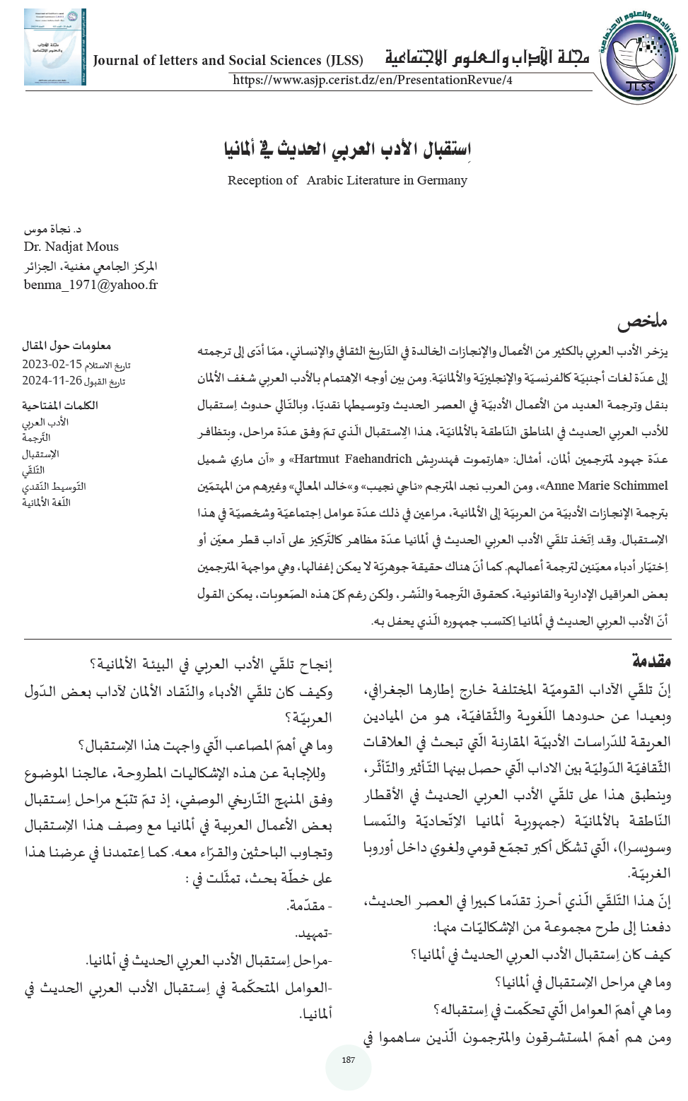 Arabic literature abounds with many immortal works and achievements in cultural and human history, which led to its translation into several foreign languages such as French, English and German. Among the aspects of interest in Arabic literature is the Germans’ passion for translating and many literary works in the modern era and for monetary mediation, and thus the occurrence of a reception for modern Arabic literature in German-speaking regions. Hartmut Faehandrich and Anne Marie Schimmel,Among the Arabs, we find the translator “Nadji Nadjib” and “Khaled Al-Ma’ali” and others interested in translating literary achievements from Arabic into German, taking into account several social and personal factors in this reception. Receiving modern Arabic literature in Germany has taken several aspects, such as focusing on the literature of a particular country or choosing certain writers to translate their works. There is also a fundamental fact that cannot be overlooked, which is that translators face many troubles and difficulties, such as some administrative and legal obstacles, such as: translation and publishing rights, but despite all these difficulties, it can be said that modern Arabic literature in Germany has gained an audience that is full of it.